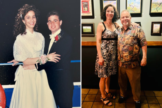 Ông Moyer và bà Hershey trong đêm dạ hội năm 1988 (trái) và trong lần hội ngộ tháng 7/2024. Ảnh: WP