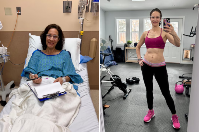 Bà Hershey chuẩn bị phẫu thuật cắt bỏ thận ngày 3/7/2024 (trái),tập thể thể dục sau 8 tháng (phải). Ảnh: WP