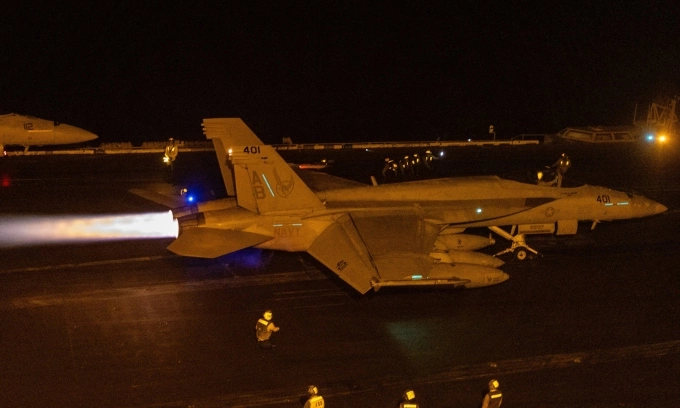 Tiêm kích F/A-18E chuẩn bị cất cánh từ tàu sân bay USS Harry S. Truman trên Biển Đỏ hôm 16/3. Ảnh: CENTCOM