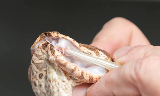 Rắn 3 nanh được nuôi theo chương trình sản xuất thuốc kháng nọc độc của Công viên Bò sát Australia. Chiếc răng thừa cực hiếm được phát hiện khi vắt nọc - quá trình bóp nhẹ các tuyến nọc,đồng thời cho rắn cắn vào một chiếc lọ để nọc chảy vào bên trong.