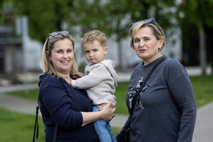 Danijela Koletic (trái) bế con trai Viktor,bên cạnh là mẹ,bà Dubravka Koletic,trong công viên ở Samobor ngày 15/4. Ảnh: AFP