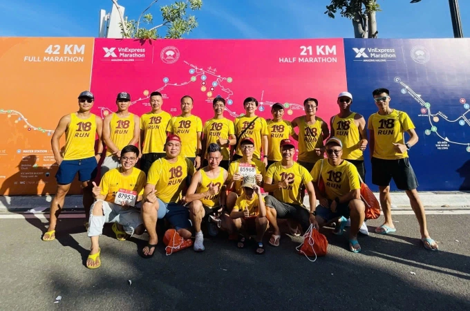 Nhóm chạy RUN18 chụp ảnh check-in tại khu expo VnExpress Marathon Hạ Long 2022. Ảnh: Nhân vật cung cấp