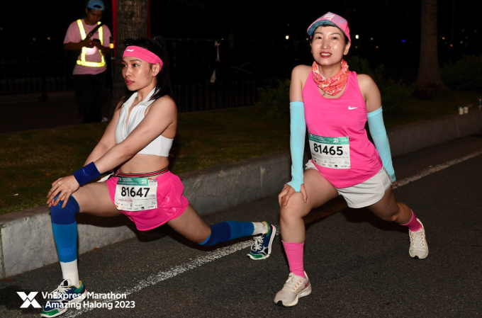 Hai nữ runner giãn cơ trước giờ xuất phát tại VnExpress Marathon Hạ Long 2023. Ảnh: VnExpress Marathon