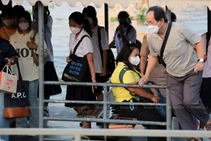 Hành khách đi phà trên sông Chao Phraya đeo khẩu trang để ngăn ngừa Covid-19 và ô nhiễm,tháng 1/2024. Ảnh: Bangkok Post