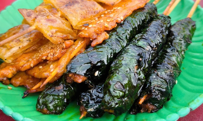 Mỗi xiên giá 4.000-6.000 đồng,gọi 10-15 xiên là đủ cho hai người nhâm nhi. Món này chấm cùng hỗn hợp nước mắm chua ngọt,tương ớt hoặc cuốn rau sống,dưa chuột,xoài xanh cho đỡ ngán.