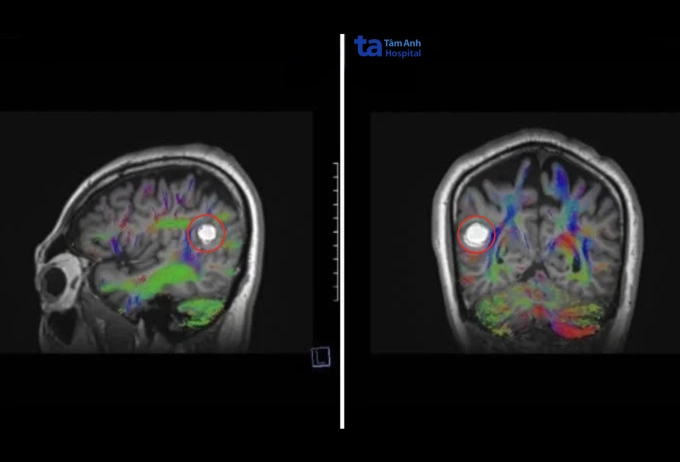 Chụp cộng hưởng từ (MRI 3 Tesla) sọ não tại Bệnh viện Đa khoa Tâm Anh TP HCM cho thấy ông Hùng có khối u mạch máu thể hang (cavernoma) kích thước 2 cm nằm sâu trong vùng đỉnh phải (phần trên giữa bán cầu đại não phải) - khu vực phụ trách vận động và cảm giác.