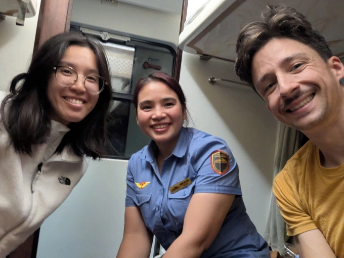 Chị Thảo và hai vị khách nước ngoài bị ách tăc trên tàu SE1. Ảnh: VNR