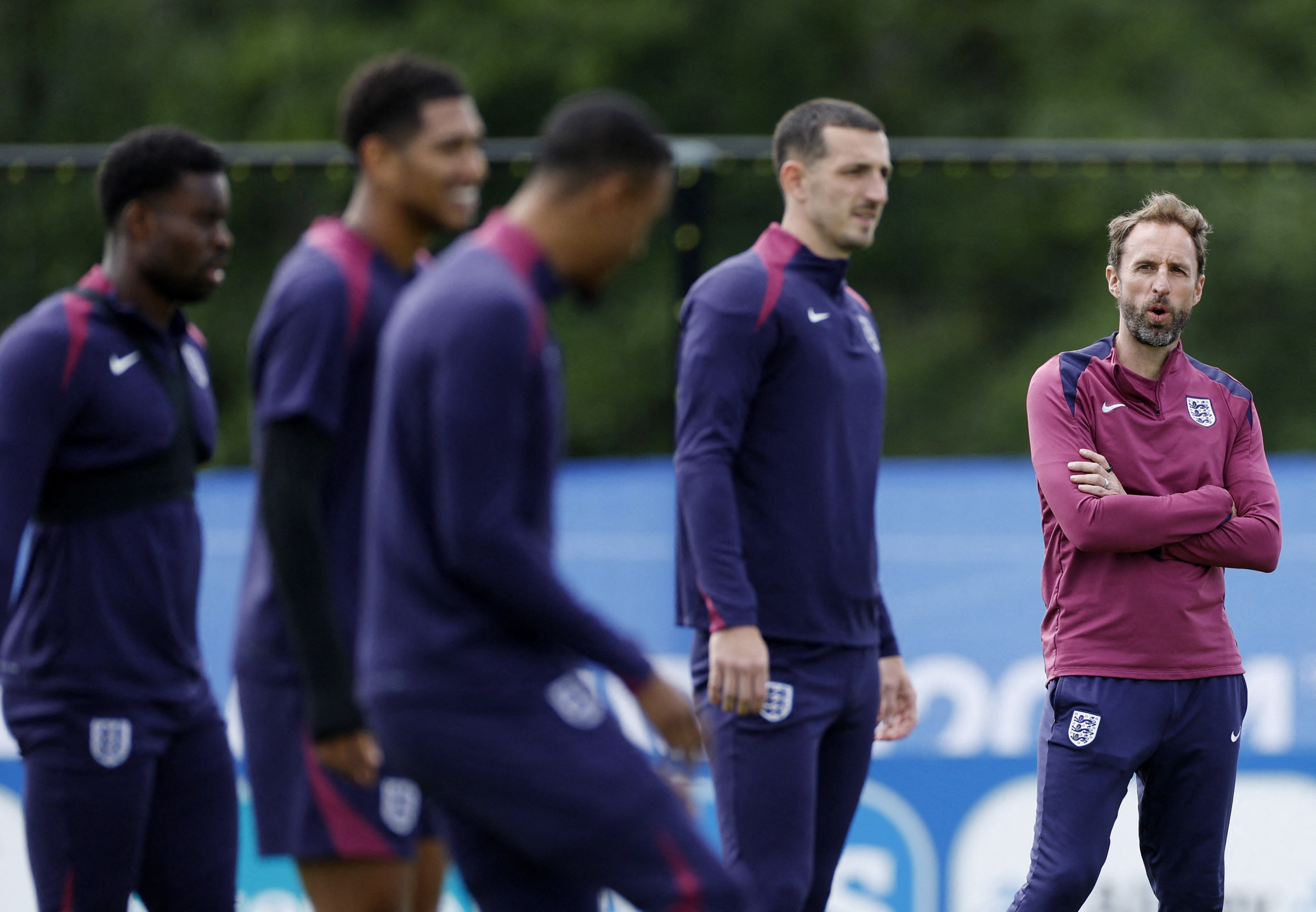 HLV Gareth Southgate (phải) trên sân tập tuyển Anh ngày 5/7,chuẩn bị đấu tứ kết Euro 2024 với Thụy Sĩ. Ảnh: Reuters