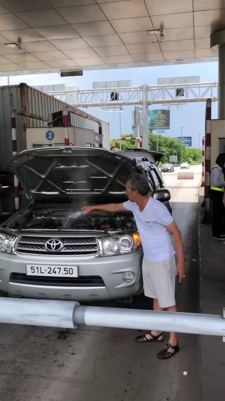 Chiếc SUV dừng trước cửa trả phí trên đường cao tốc Long Thành - Dầu Giây hôm 6/8,ca-pô mở lên,và có khói trắng tỏa ra từ miệng két nước làm mát. Một người đàn ông dùng nước khoáng để châm thêm vào két nước tản nhiệt lúc máy đang nóng. Ngay lập tức nước sôi,bốc hơi trắng mù mịt. Chủ xe phải rụt tay và lùi tránh. Người quay video cũng phải tránh ra xa tránh bị bỏng.