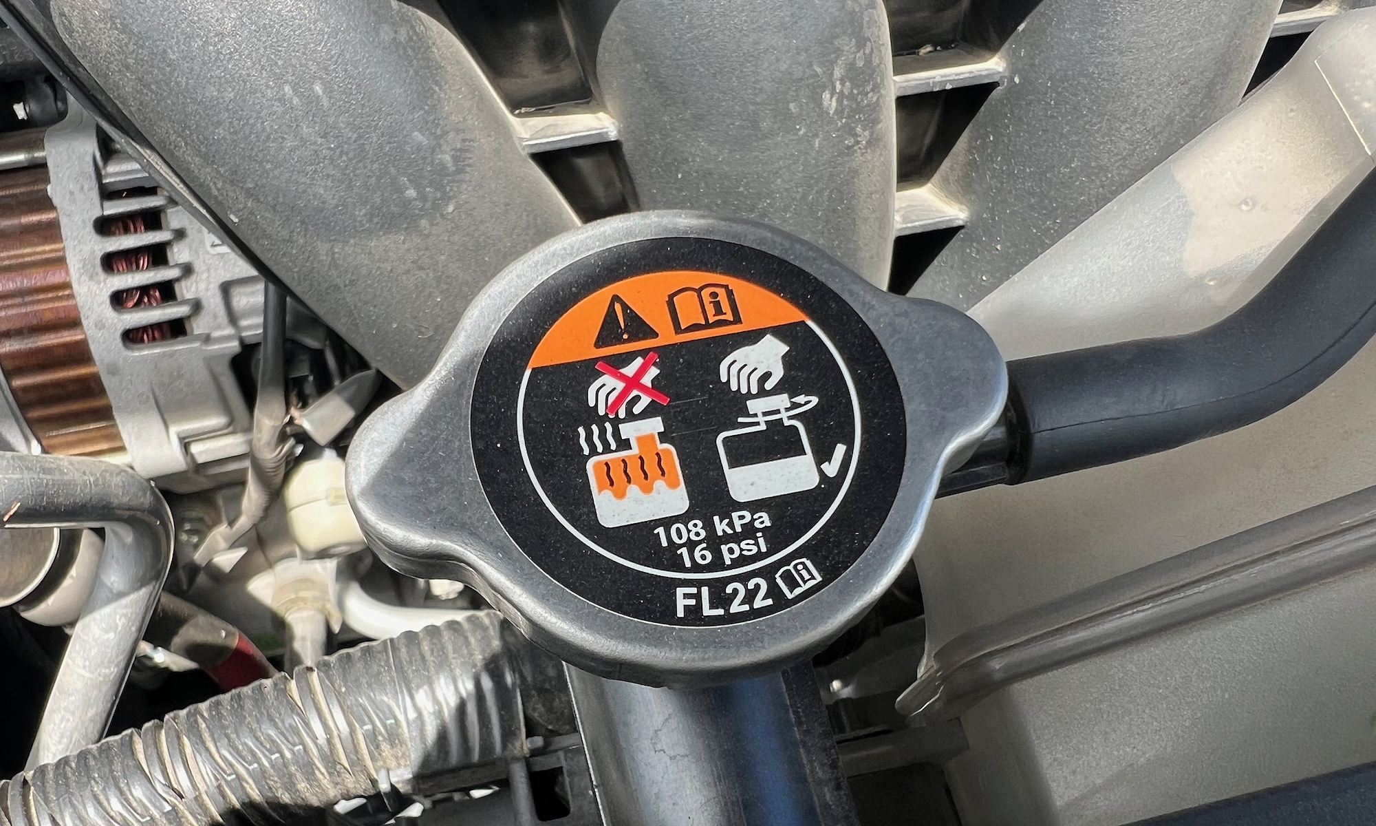 Nắp châm nước làm mát trên mẫu xe Nhật,có ghi cảnh báo không mở ra lúc máy nóng,và mức suất khi máy nóng. Ảnh: Hồ Tân