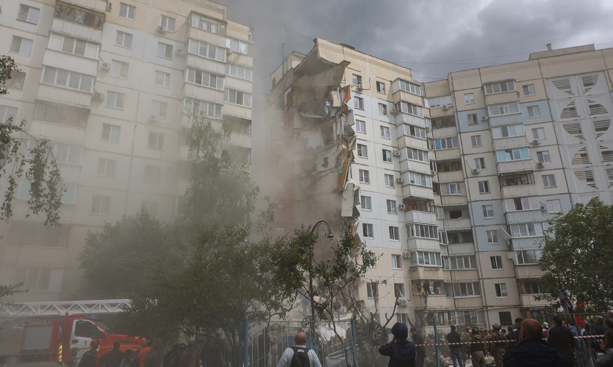 Tòa chung cư bị sập một phần do trúng tập kích của Ukraine ở tỉnh Belgorod hôm 12/5. Ảnh: AFP