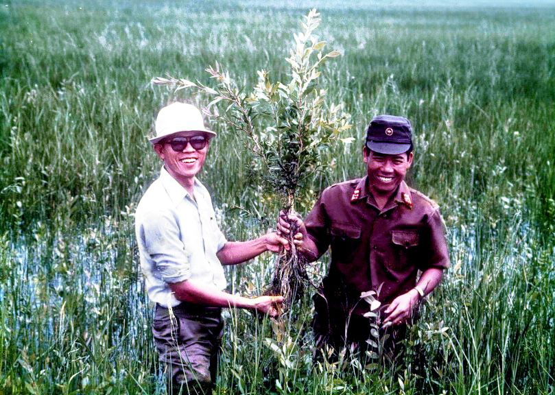 GS Võ Tòng Xuân (trái) thực địa trên những cánh đồng ở Đồng Tháp Mười,năm 1985. Ảnh: Tư liệu