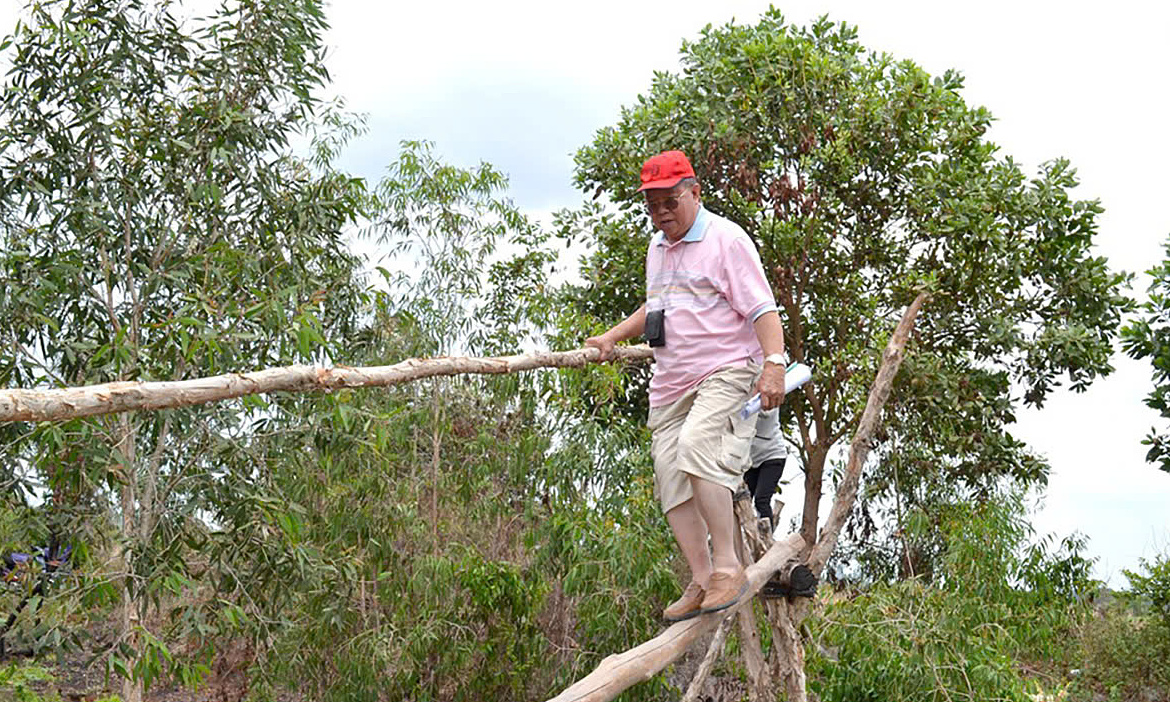 GS Võ Tòng Xuân đi cầu khỉ khi khảo sát thực địa ở rừng U Minh,Kiên Giang,năm 2021. Ảnh: Tư liệu