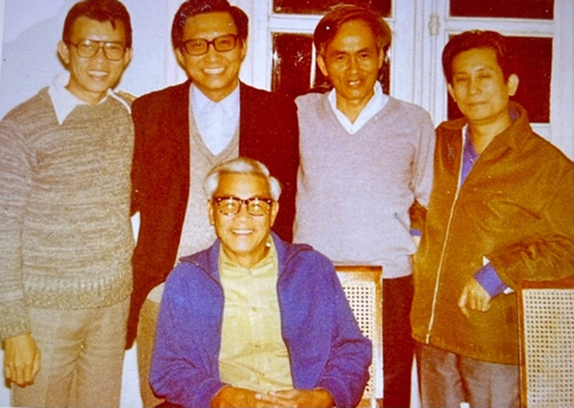 GS Võ Tòng Xuân (ngoài cùng bên trái),GS Nguyễn Ngọc Trân (thứ hai từ trái qua) cùng một số chuyên gia gặp Phó chủ tịch Hội đồng Bộ trưởng Võ Văn Kiệt (ngồi) sau chuyến công tác ở Mỹ về,năm 1982. Ảnh: Tư liệu