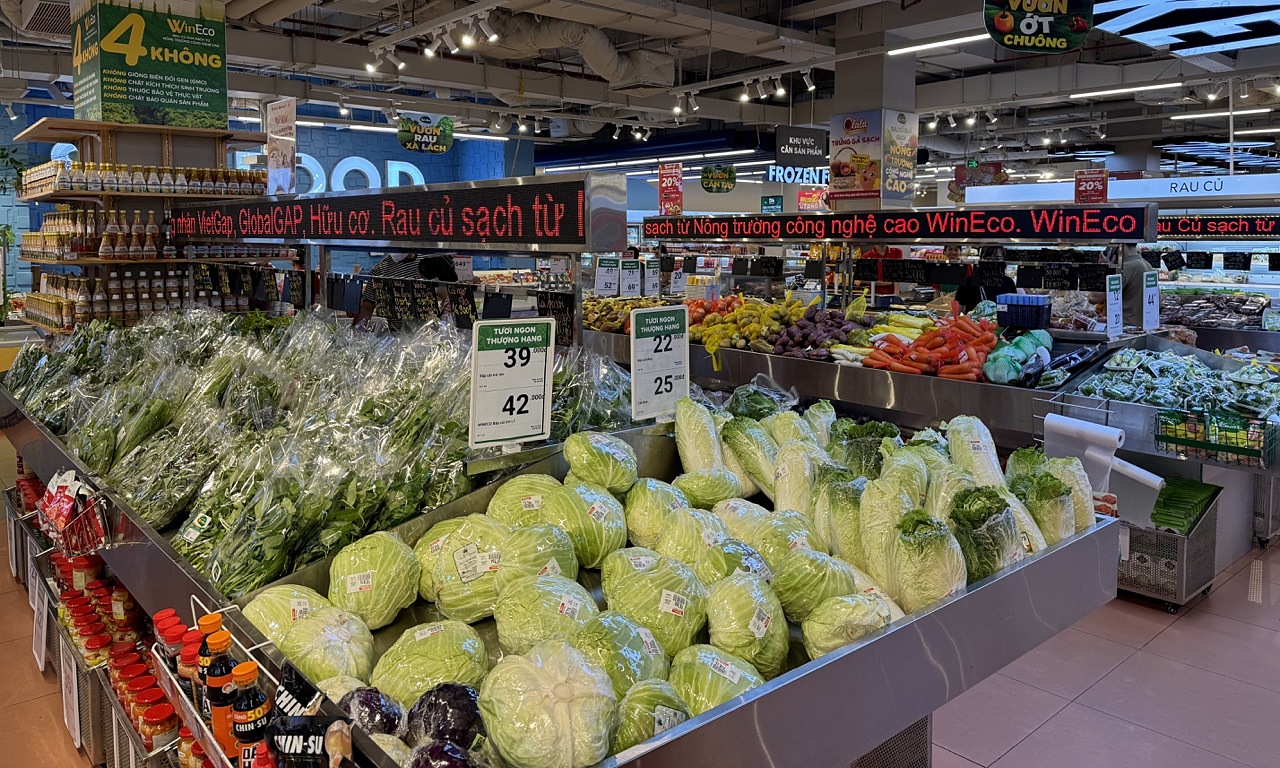 Quầy hàng rau,củ tại một siêu thị lớn trên đường Trần Đăng Ninh,Cầu Giấy lúc 12h trưa 8/9. Ảnh: Anh Tú