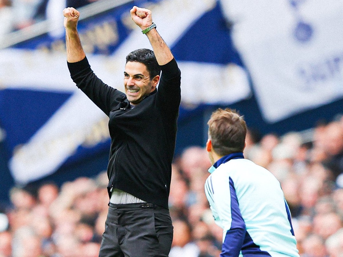 HLV Mikel Arteta giơ nắm đấm ăn mừng,sau khi trung vệ Gabriel đánh đầu ghi bàn mở tỷ số trong trận đấu Tottenham ở vòng 4 Ngoại hạng Anh. Ảnh: AFP.