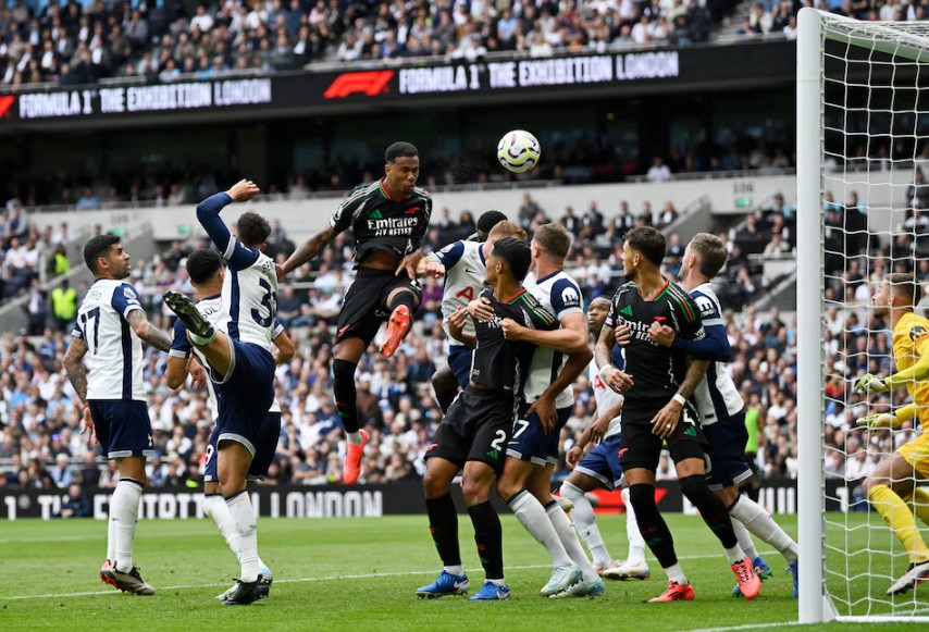 Gabriel Magalhaes bật cao đánh đầu ghi bàn duy nhất giúp Arsenal thắng Tottenham 1-0 ở vòng bốn Ngoại hạng Anh tại sân Tottenham Hotspur,London,Anh ngày 15/9. Ảnh: Reuters