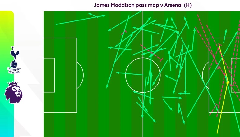 Tuy nhiên,người hâm mộ Tottenham đã trông chờ nhiều hơn thế,nhất là nhạc trưởng James Maddison. Bản đồ đường chuyền bên trên cho thấy tiền vệ người Anh gặp khó khăn thế nào để chuyền xuyên các tuyến phòng ngự của Arsenal,với các đường màu đỏ biểu thị những đường chuyền không thành công.