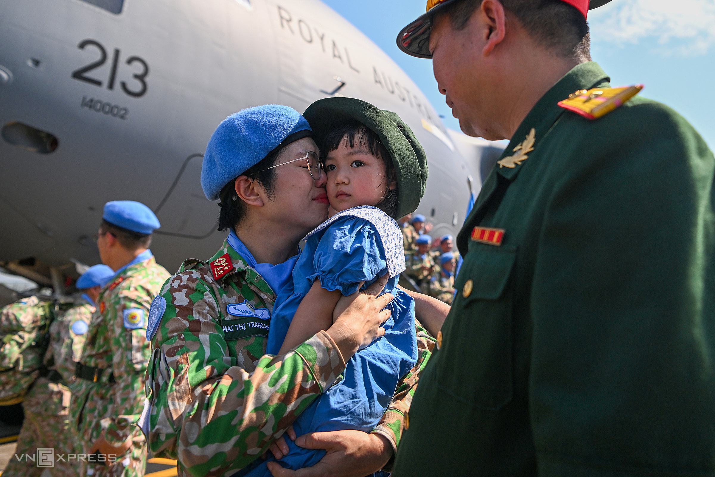 Sĩ quan Mai Thị Trang Nhung chia tay con gái Bình An trước khi lên đường làm nhiệm vụ tại Đội công binh số 3. Ảnh: Giang Huy