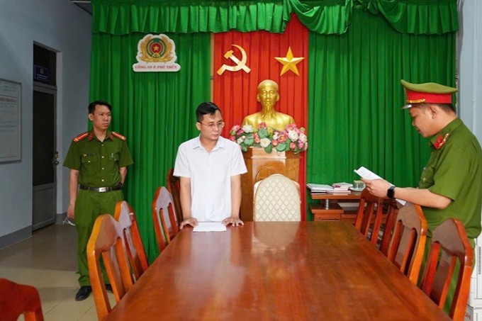 Phạm Thanh Tùng,Giám đốc Công ty địa ốc Dreamland (áo trắng) nghe cảnh sát đọc lệnh bắt tạm giam,ngày 25/10. Ảnh: Công an Bình Thuận