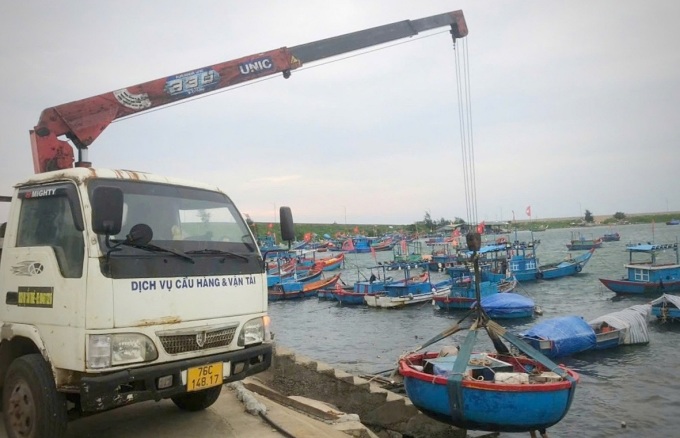 Người dân Lý Sơn cẩu thúng lên bờ trước bão Trà Mi,ngày 25/10. Ảnh: An Bình