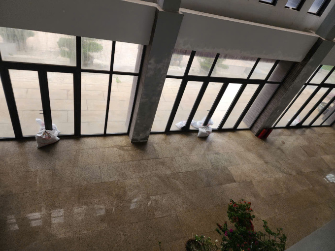 Một trụ sở cơ quan ở đảo Lý Sơn chằng chống cửa ứng phó bão Trà Mi. Ảnh: An Bình