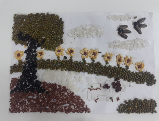 Sau đó tôi phát hiện ra bé dùng khoảng một chén đậu và gạo để dán lên giấy để làm bài tập Mỹ Thuật. Tôi thật bất ngờ và cảm thấy khó chịu vì đó là nội dung bài tập trên lớp mà mỗi học sinh phải làm và nộp cho cô giáo.