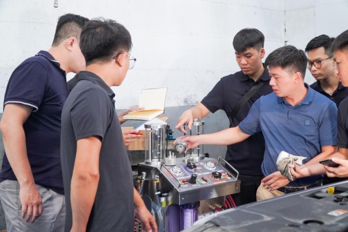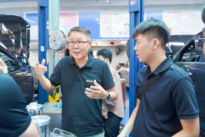 Chuyên gia của Impact Hàn Quốc (bên trái) chia sẻ kinh nghiệm sử dụng thiết bị bảo dưỡng ôtô tại Việt Nam. Ảnh: VnPetro
