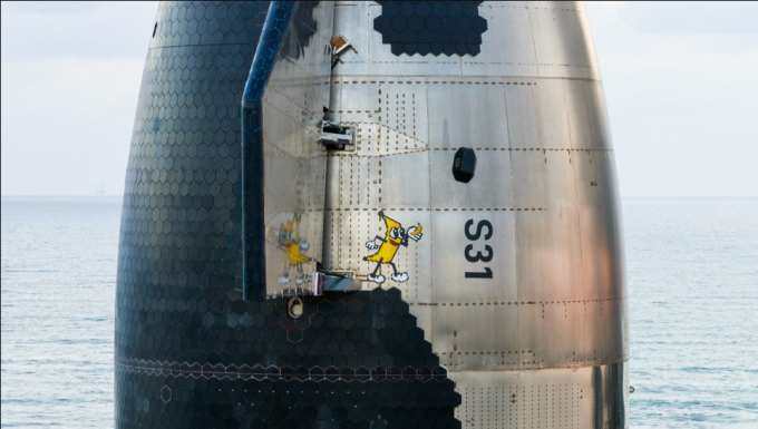 Tầng trên Starship mang theo quả chuối nhồi bông với vỏ bề ngoài bằng thép không gỉ có trang trí một quả chuối hoạt hình. Ảnh: Space