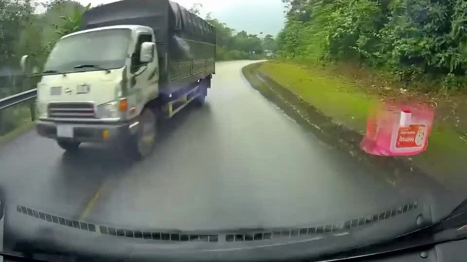 Vượt ở khúc cua,xe tải ép xe đi đúng chiều ra lề đường