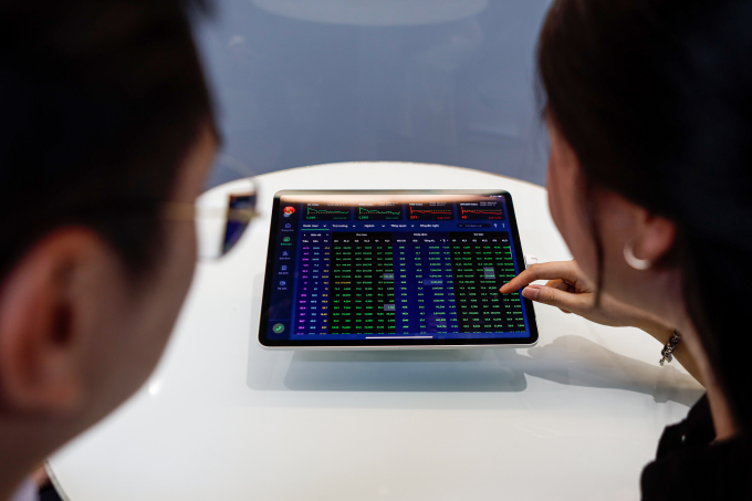 Hai nhà đầu tư đang theo dõi bảng điện tại một công ty chứng khoán ở quận 1 (TP HCM),tháng 10/2024. Ảnh: An Khương
