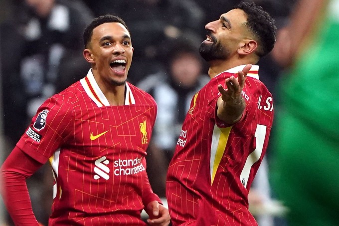 Alexanderp-Arnold (trái) và Salah mừng bàn trong trận Newcastle 3-3 Liverpool tối 4/12. Ảnh: PA