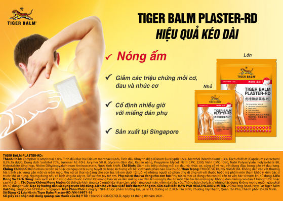 Theo nhà sản xuất,Tiger Balm Plaster-RD là miếng dán hydrogel,có tác dụng làm ấm nóng,tỏa mùi hương thảo dược. Sản phẩm dùng kèm với miếng dán phụ,giữ cho miếng dán không bong tróc và cố định trong thời gian kéo dài. Người dùng có thể sử dụng sau khi chạy dài,hỗ trợ thư giãn cơ. Sản phẩm sản xuất tại Singapore. Độc giả quan tâm có thể tìm hiểu tại đây.