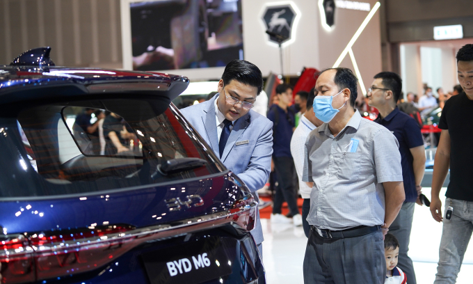 Nhân viên bán hàng trao đổi với khách tại triển lãm ôtô Việt Nam,tháng 10/2024. Ảnh: Thành Nhạn