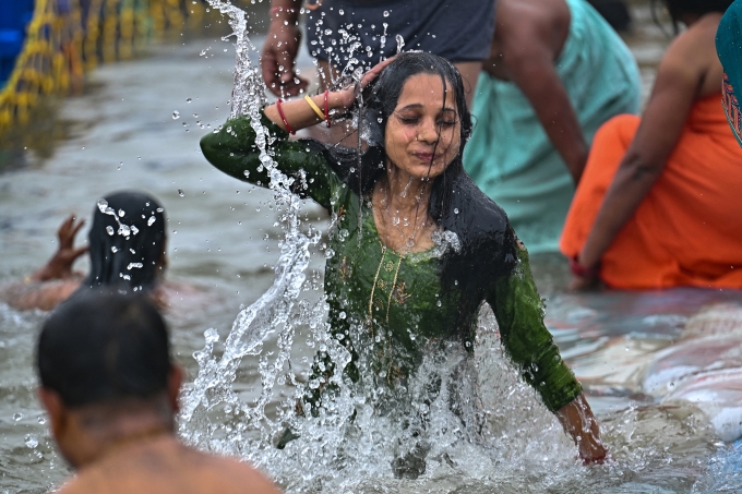 Đám đông hành hương bắt đầu nghi thức tắm trước khi Mặt trời mọc ngày 13/1 ở bờ sông Sangam,nơi được coi là hợp lưu của sông Hằng,sông Yamuna và Saraswati,dòng sông thiêng theo truyền thuyết,tại thành phố Prayagraj,bang Utta Bradesh,phía bắc Ấn Độ.