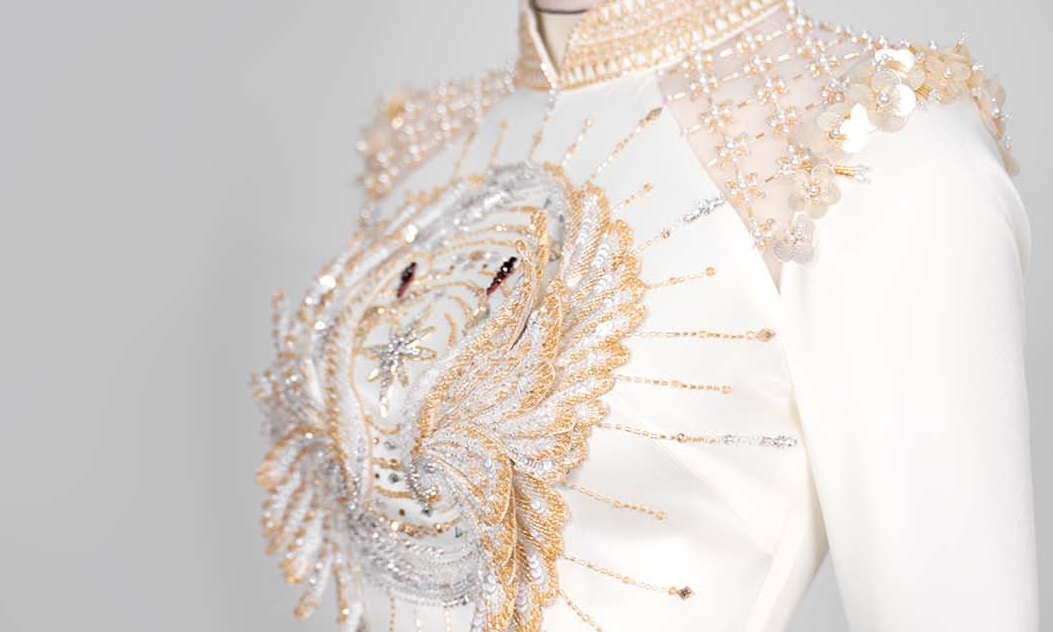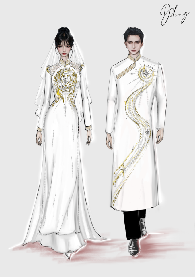 Trang phục làm từ chất liệu lụa cao cấp với điểm nhấn ở phần viền cổ,tay áo - họa tiết hoa văn trên trống đồng,thêu bằng chỉ ánh kim. Áo dài của cô dâu thêu đính 3D đôi thiên nga trên nền hình ảnh mặt trăng,mặt trời lồng vào nhau,mang ý nghĩa về tình yêu vĩnh cửu. Còn áo dài của chú rể gồm họa tiết con đường hình chữ S,lấy cảm hứng từ hình ảnh đi về hướng mặt trời.