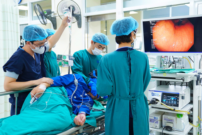 Thạc sĩ Đào Trần Tiến nội soi cho diễn viên Minh Tiệp. Ảnh: Bệnh viện Đa khoa Tâm Anh