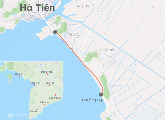 Vị trí đường ven biển Hà Tiên. Đồ họa: Hoàng Thanh