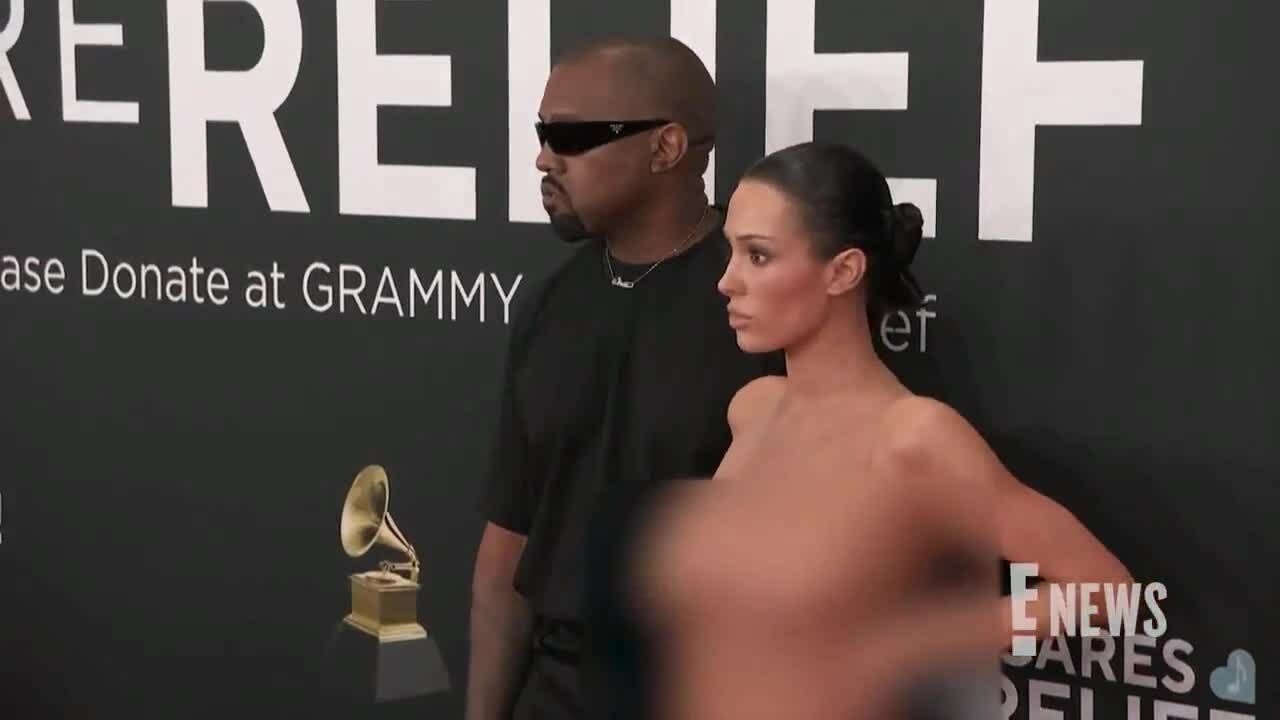 Vợ chồng Kanye West - Bianca Censori tạo dáng trên thảm đỏ Grammy hôm 2/2. Video: E!