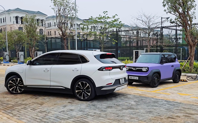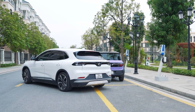 Chiếc VinFast VF 8 có camera 360 độ,gương chiếu hậu tự động cụp khi lùi hỗ trợ tài xế đỗ xe dễ dàng hơn. Ảnh: Quang Anh