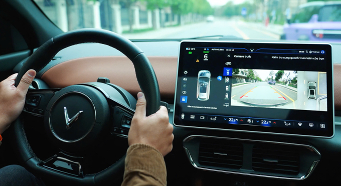 Camera trên VinFast VF 8 hiển thị đồng thời hình ảnh phía sau và góc 360 độ khi đỗ xe. Ảnh: Quang Anh
