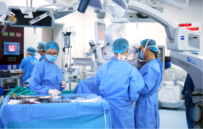 Êkíp bác sĩ Tâm Anh phẫu thuật kẹp cổ túi phình cho người bệnh. Ảnh: Bệnh viện cung cấp