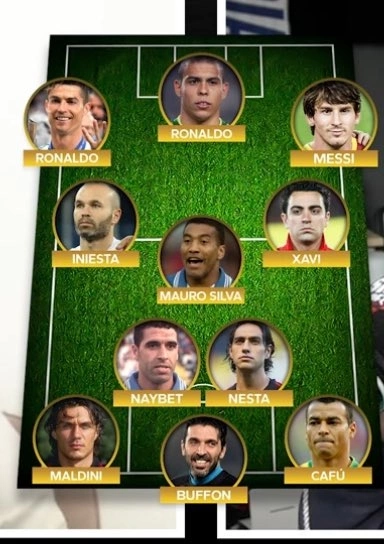 Đội hình của Scaloni gồm thủ môn Gianluigi Buffon,hậu vệ Cafu,Alessandro Nesta,Noureddine Naybet,Paolo Maldini,tiền vệ Xavi,Mauro Silva,Andres Iniesta,tiền đạo Messi,Ronaldo Nazario de Lima và Cristiano Ronaldo. Trong đó,Naybet và Silva là đồng đội cũ của Scaloni ở CLB Deportivo La Coruna,cùng nhau vô địch La Liga 2000 và Cup Nhà vua 2002.