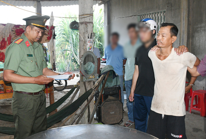 Công an tỉnh Vĩnh Long đọc lệnh bắt tạm giam Thạch Chanh Tra. Ảnh: Hổ Giang