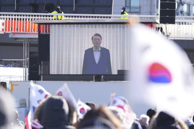 Người ủng hộ ông Yoon Suk-yeol theo dõi gần tư dinh tổng thống Hàn Quốc ở Seoul ngày 15/1. Ảnh: AP