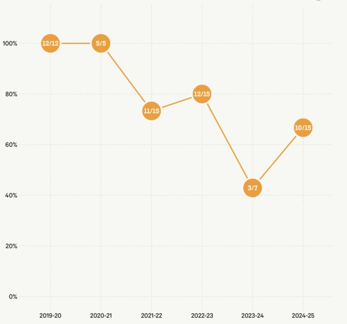 Tỷ lệ sút phạt đền thành công của Real trong sáu mùa gần đây. Ảnh: Athletic