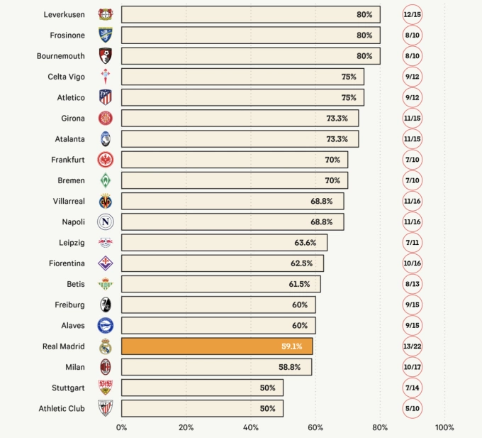 Trong 20 đội đã hưởng 10 quả phạt đền trở lên ở các giải VĐQG và Champions League tại châu Âu kể từ mùa 2023-2024,Real chỉ đứng thứ 17 về tỷ lệ thành công.