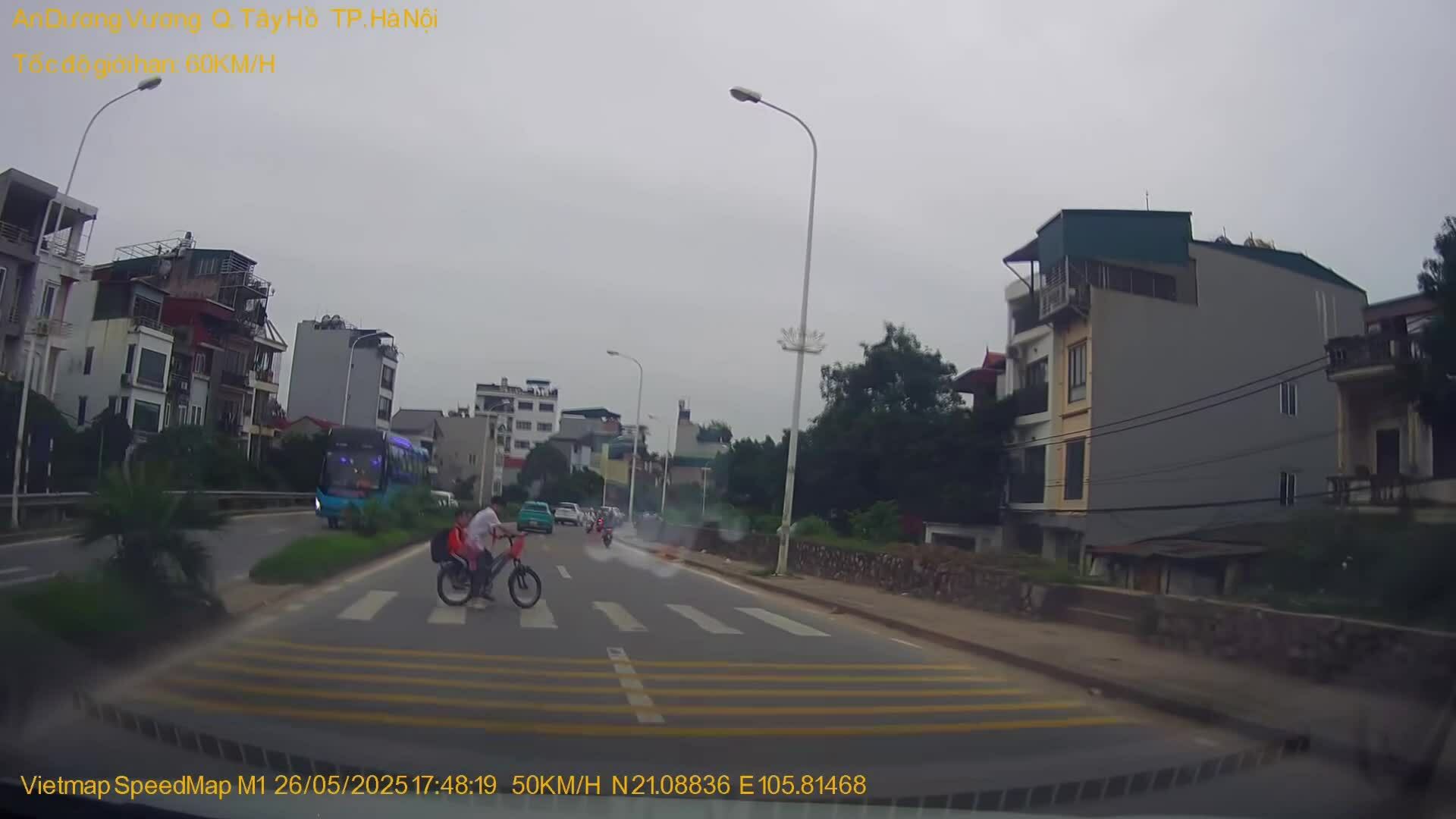 Tình huống giao thông: Trên đoạn đường đê cong trong thành phố,tài xế lái xe ở tốc độ hơn 50 km/h,đi qua hai gờ giảm tốc nhưng không có dấu hiệu giảm tốc. Đúng lúc này,sau góc cua khuất có lối mở cho người đi bộ sang đường,hai học sinh đi xe đạp lao ra cắt ngang đường. May mắn tài xế kịp phanh dừng tránh tai nạn.