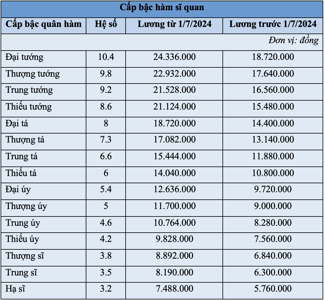 Theo đó,bên cạnh mức lương hưởng hàng tháng,sĩ quan Quân đội nhân dân cũng được hưởng phụ cấp thâm niên (tính theo mức lương hiện hưởng và thời gian phục vụ tại ngũ) cộng với phụ cấp công vụ và phụ cấp chức vụ lãnh đạo. Mức phụ cấp của quân đội được tính bằng cách dùng hệ số phụ cấp nhân với 2,34,thay vì 1,8 như trước 1/7.