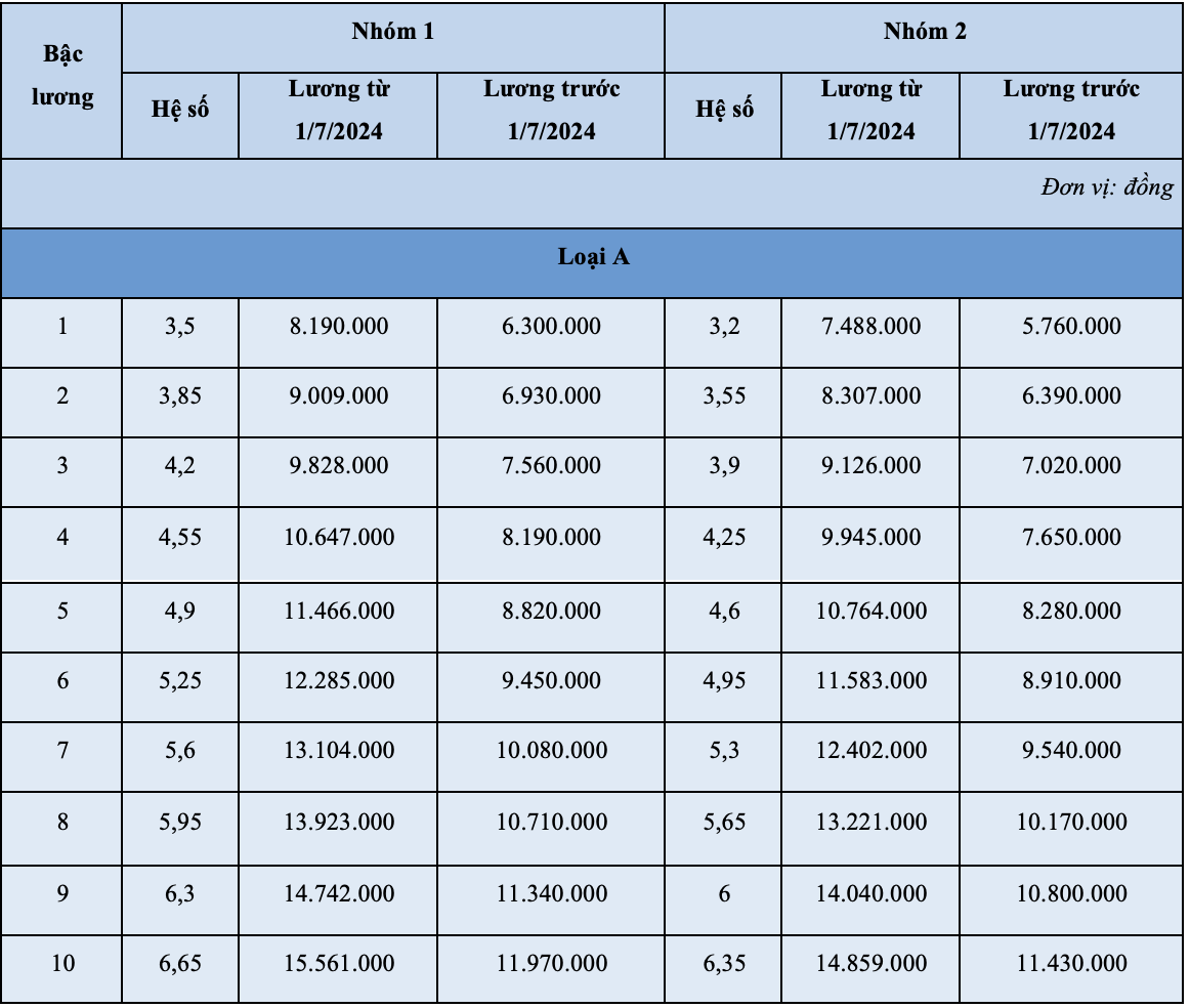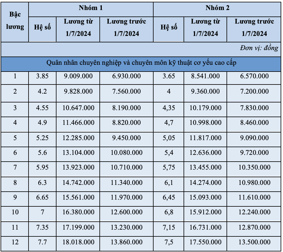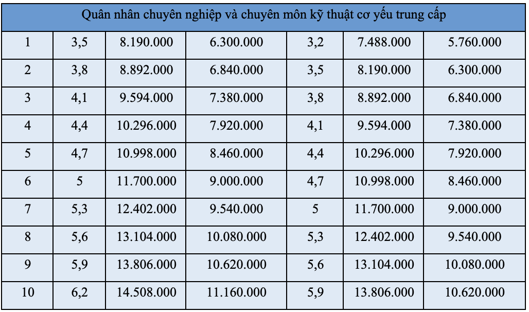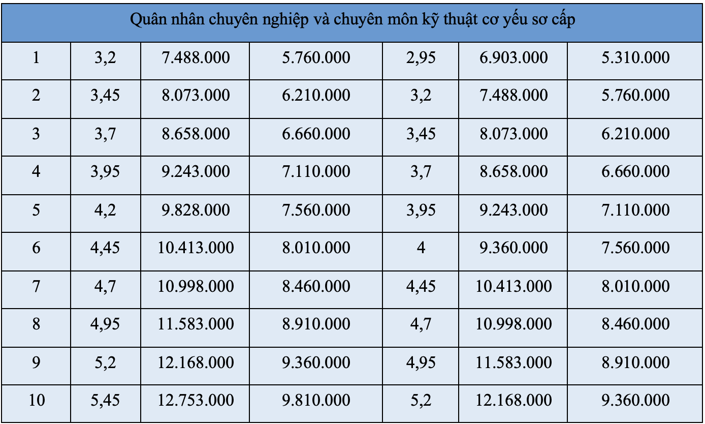 Bảng lương quân nhân chuyên nghiệp và chuyên môn kỹ thuật cơ yếu: